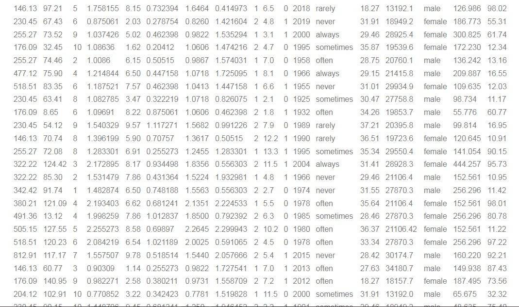 | 176.09 | 140.95 | 9 | 0.982271 | 2.58 | 0.380211 | 0.9731 | 1.558709 | 2 | 7.2 | 1 | 2012 | often | 18.27 | 18157.7 | female | 187.495 | 73.56 |